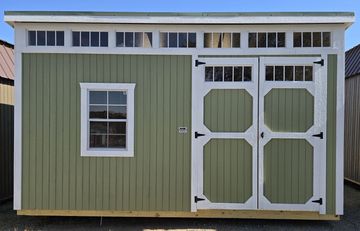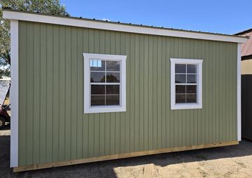 The building has Radiant Barrier (keeps the building cooler in the summer, warmer in the winter), 7-10"x23" Transom Windows, 3-2x3 Windows, Duratemp Siding, 5/8" Tongue & Groove Douglas Fir Plywood, 150 MPH Hurricane Screws, and Double Doors w/Transom Windows. The Primary Color is Olive w/Pearl Trim & Moss Roof. #465769