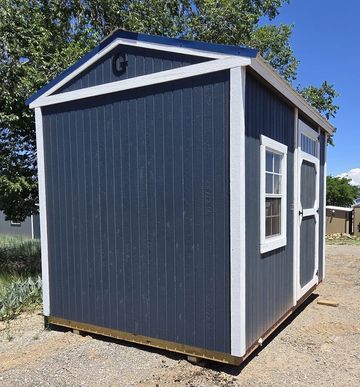 This building has Radiant Barrier, Duratemp Siding, Tongue & Groove 5/8" Douglas fir Plywood, 26 Gauge Metal Roof, 150 MPH Hurricane Screws, and Single Door (48"). Primary Color is Steel Blue, Graphite Door, w/Pearl Trim & Volcanic Ash. #500617