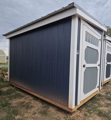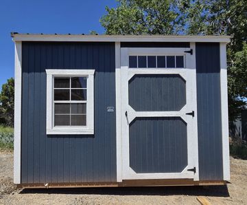 This building has Radiant Barrier (keeps the building cooler in the summer warmer in the winter) 8' walls, 1-23 Window, Duratemp Siding, 5/8" Douglas Fir Tongue & Groove Plywood Floor, 150 MPH Hurricane Screws, and Single Door (48"). Primary Color is Steel Blue w/Pearl Trim & Blue Oasis Roof. #493926