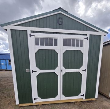 This building has Radiant Barrier (keeps the building cooler in the summer, warmer in the winter), Double Door w/Transom Window (72"), and Duratemp Siding, Tongue & Groove 5/8" Douglas fir Plywood, 26 Gauge Metal Roof, 150 MPH Hurricane Screws. The Primary Pine w/Pearl Trim & Emerald Roof. #477768