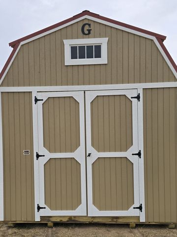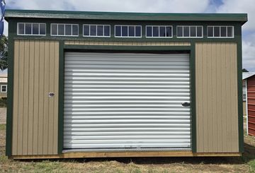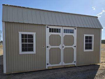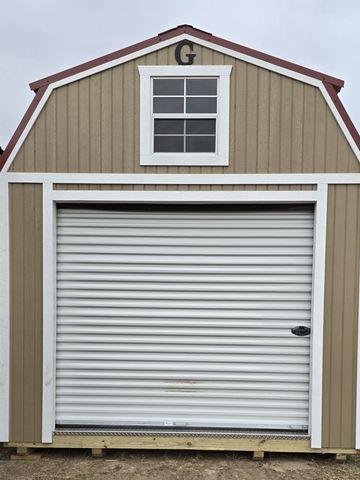 This building has Radiant Barrier (keeps the building cooler in the summer, warmer in the winter), 8' walls, 4' lofts w/transom windows (front/rear), Double Doors w/transom windows, and Duratemp Siding, Tongue & Groove 5/8" Douglas fir Plywood, 26 Gauge Metal Roof, 150 MPH Hurrican Screws. The Primary Color is Desert w/Light Khaki Trim & Cocoa Roof. #457113