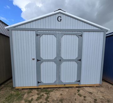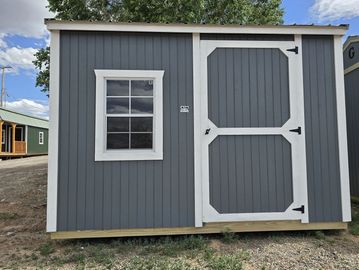This building has Radiant Barrier (keeps the building cooler in the summer warmer in the winter) 8' walls, 1-23 Window, Duratemp Siding, 5/8" Douglas Fir Tongue & Groove Plywood Floor, 150 MPH Hurricane Screws, and Single Door (48"). Primary Color is Graphite w/Pearl Trim & Smokey Gray Roof. #493928