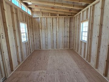 2x6 Floor Joist, 12" O.C., Double Stud every 48", 89" Studs on all four walls, Soffit Vents Front & Back, Front Wall has additional 15" Pony Wall, 5 or more 10"x23" Transom Windows can be added to this wall, 2/12 Roof Pitch, 4" overhang on all four sides, Roof Design is changed to meet IBC Requirements. Trusses are 24" O.C. with Double Trusses every 48" O.C.